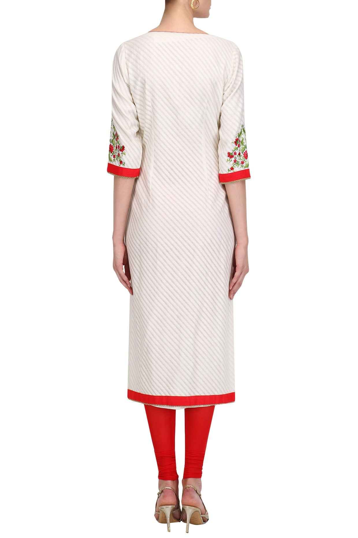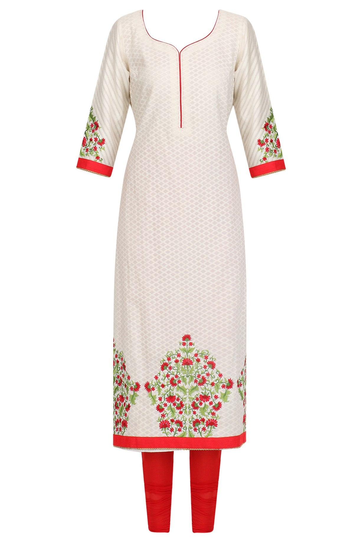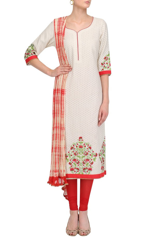 White cotton threadwork suit comes with red churidar and red dupatta.