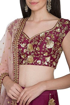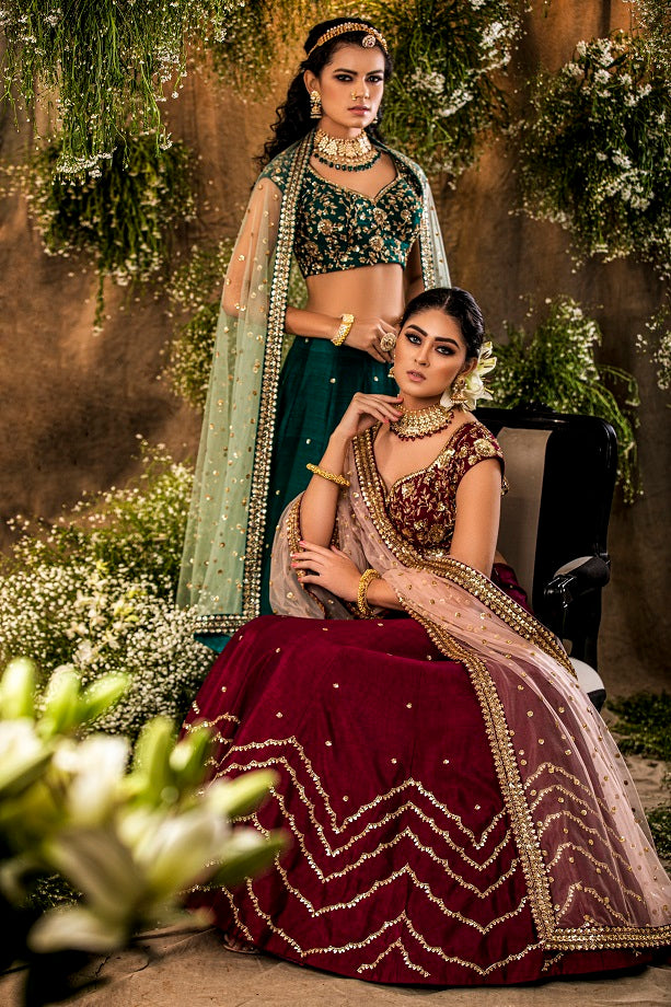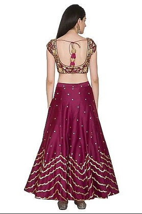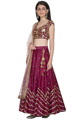Featuring a wine lehenga skirt in dupion silk base with dabka, sequins and swarovski embroidery. It is paired with a matching blouse and dupatta.